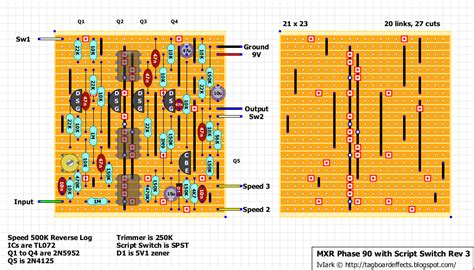 Web this version of the phase 90 is different from the standard mxr phase 90 because it comes with a script button. After googling this pcb number i found this photo that proves. Any excellent analysis with schematic can be found at electrosmash.