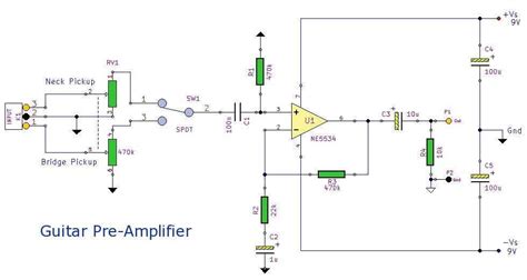 Web simple op amp preamp inspired by the musicman hd65, hd130, etc. With such a low power supply voltage you do not want the r1 and r2 attenuator at the output that is biased to ground. Resistors r3 and r5 center the op amp input and output at the midpoint between the power supplies to allow for the widest possible output signal swing.